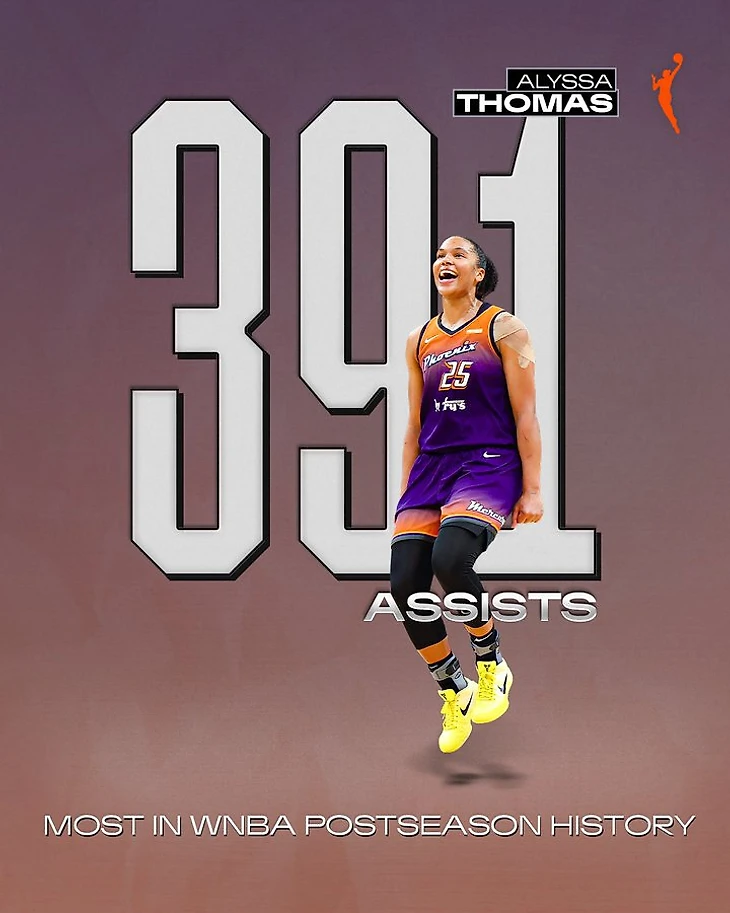 5-я передача форварда «Финикса» во втором матче финала против «Лас-Вегаса» довела её общий показатель до 391-го, что позволило Алиссе Томас обойти Кортни Вандерслут и стать лидером женской НБА по передачам в плей-офф.