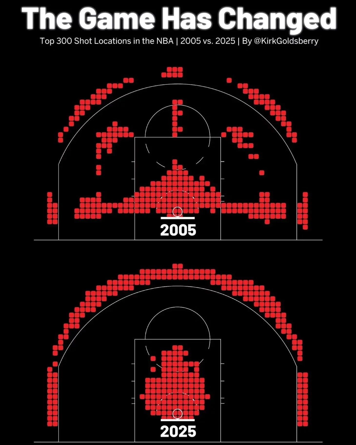 Аналитик Кирк Голдсберри проиллюстрировал отказ от средних бросков через 300 основных атакующих позиций в 2005 и 2025 годах.