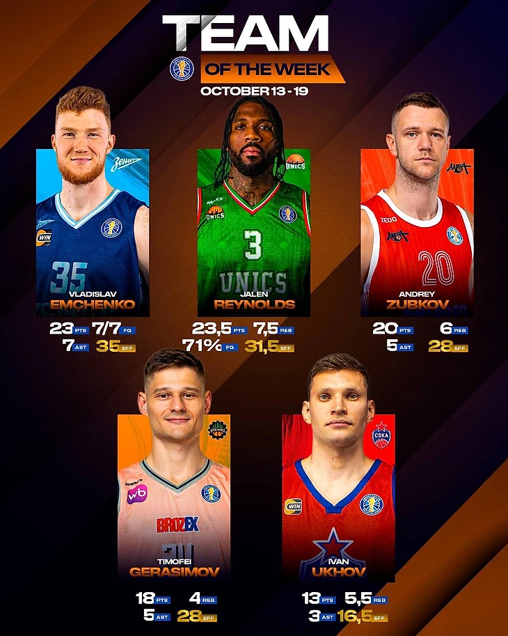Емченко, Рейнольдс, Зубков, Герасимов и Ухов – в символической пятерке недели Единой лиги ВТБ