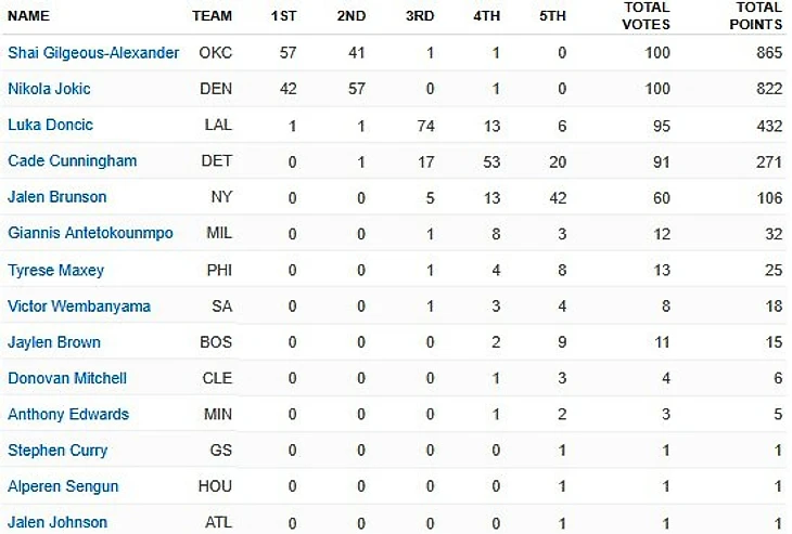 ESPN опросил 100 представителей медиа по поводу награды самому ценному игроку регулярного чемпионата НБА. Первая строчка (57 голосов за 1-е место) досталась разыгрывающему «Оклахомы» Шэю Гилджес-Александеру. Центрового «Денвера» Николу Йокича поставили на 1-ю позицию 42 опрошенных. 1 последний голос получил разыгрывающий «Лейкерс» Лука Дончич.
