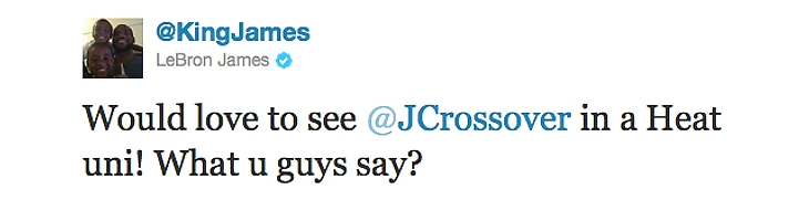 Форвард «Майами» ЛеБрон Джеймс на один из многочисленных вопросов в Твиттере об усилении «Хит» ответил, что хотел бы видеть в команде защитника «Атланты» Джамала Кроуфорда или разыгрывающего «Финикса» Стива Нэша.