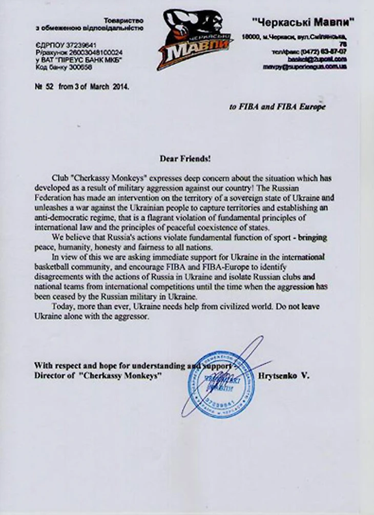 Украинский клуб «Черкасские Мавпы» обратился к ФИБА и ФИБА-Европа с письмом, в котором попросил отстранить российские команды и сборные от международных соревнований в связи с событиями в Крыму.