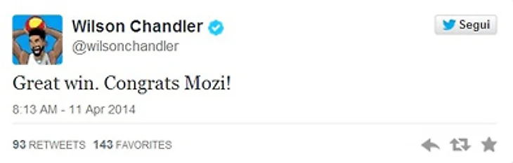 Форвард «Денвера» Уилсон Чендлер в своем Твиттере поздравил товарища по команде Тимофея Мозгова после матча с «Голден Стэйт», в котором россиянин записал на свой счет 23 очка и рекордные 29 подборов.