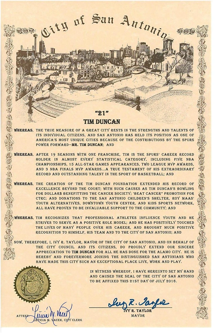 Торжества скромные – но как раз в духе самого Тима Данкана. Несколько дней назад мэр Сан-Антонио подписала указ о том, что 21 (в честь номера Данкана) июля будут официально отмечать День Тима Данкана.