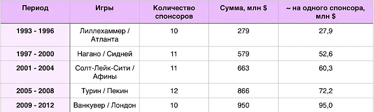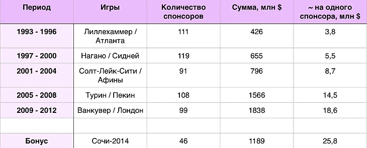 «Домашние» спонсоры – это необязательно компании из страны-хозяйки Олимпиады, просто мне захотелось сделать это все уютнее. Среди них есть и глобальные корпорации, главное отличие – контракты заключаются на определенные игры и в них намного больше ограничений по использованию бренда Олимпиады. Суммы контрактов меньше, спонсоров больше, как итог:
