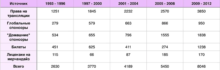 Структура выручки МОК за последние пять циклов впечатляет (все цифры – в миллионах долларов):