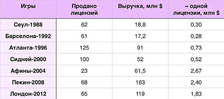 Как несложно заметить – доля дохода от продажи билетов неуклонно снижалась за последние пять циклов. Исключение – последний, когда Игры проводились в платежеспособных Ванкувере и Лондоне. Но с такими отчислениями от спонсоров и стоимостью прав на трансляции – на этот фактор можно не обращать внимания.