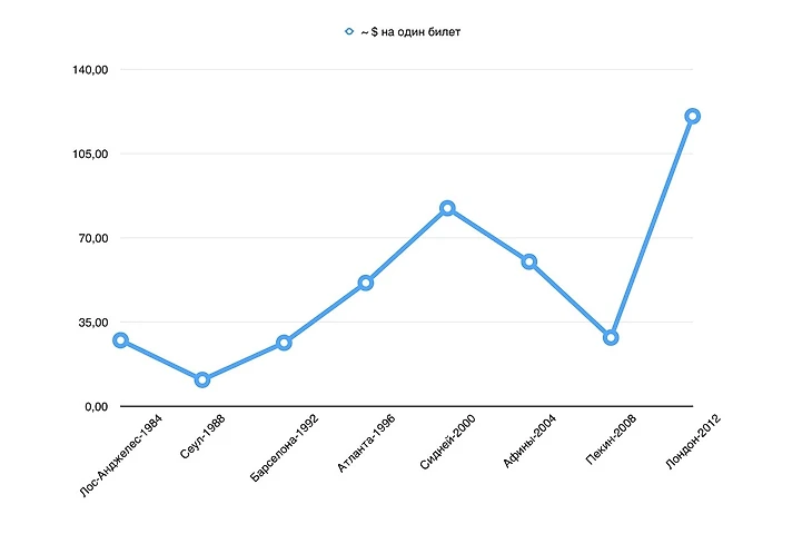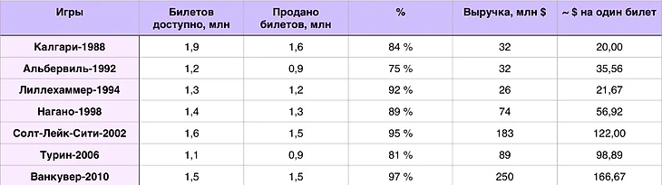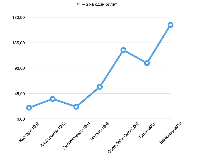 Кстати, тут тоже есть забавный момент, связанный с Сочи-2014. Если верить МОК, то «средняя» цена билета была даже выше, чем в Ванкувере – 205$! Я не поверил.