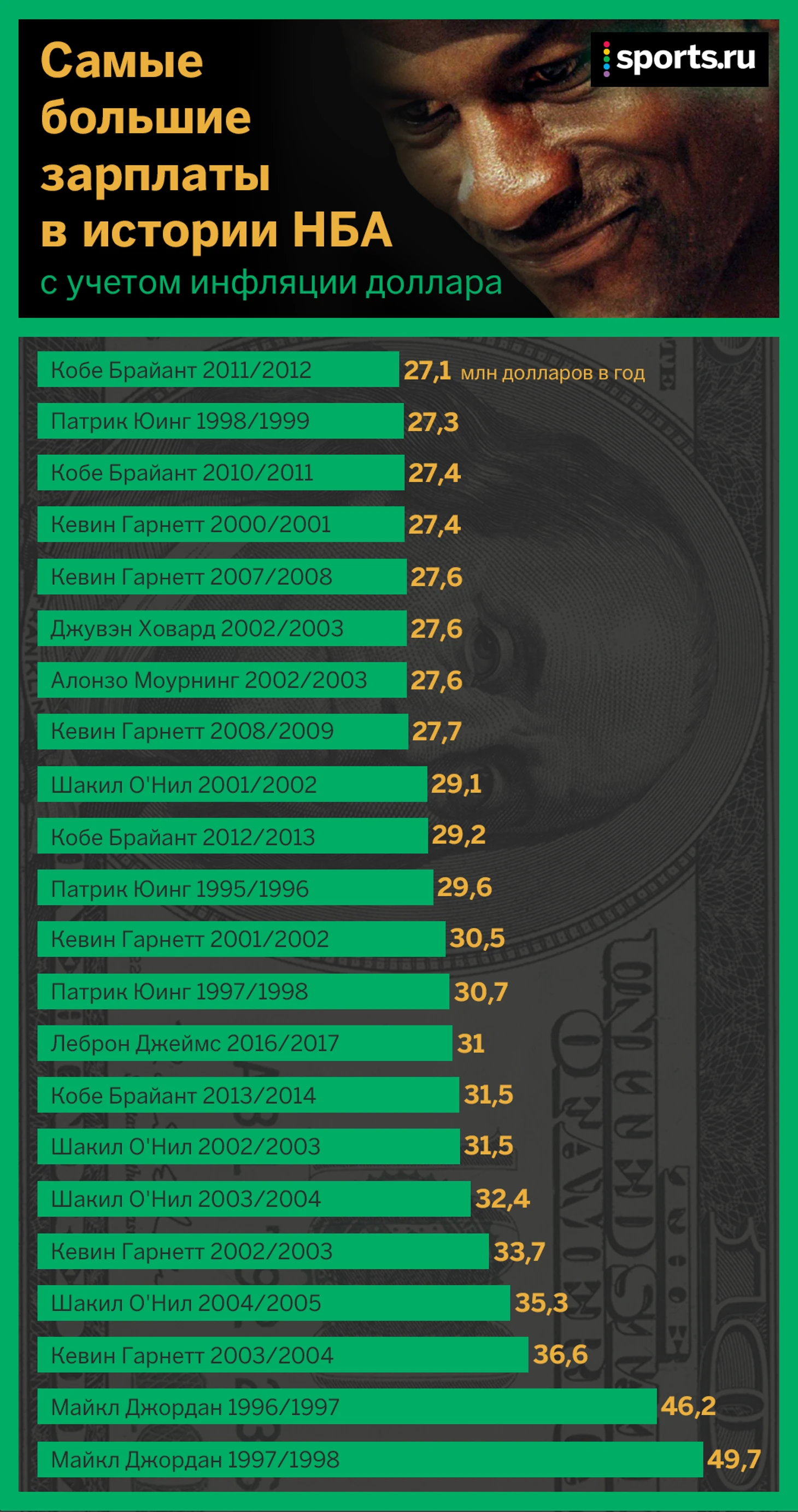 И даже резкий рост потолка зарплат в последние два лета пока не дает оснований предположить, что кто-то в ближайшие годы сможет сместить Майкла Джордана с первой строчки этого рейтинга. Если новое Коллективное соглашение не сделает максималки более свободными (сейчас они ограничены 35% от потолка при стаже в 10 лет и более), то надо будет ждать потолка зарплат в 140-150 млн, чтобы увидеть зарплату, сравнимую с «инфляционной» джордановской.