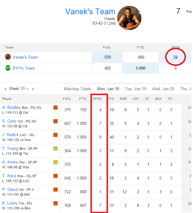 У нас (лига формата Н2Н = Head to Head) правила такие: есть 9 категорий Процент с игры (FG%), Процент со штрафа (FT%), Кол-во забитых 3-х очковых (3PTM), Очки (PTS), Подборы (REB), Передачи (AST), Отборы (ST), Блокшоты (BLK), Потери (TO)