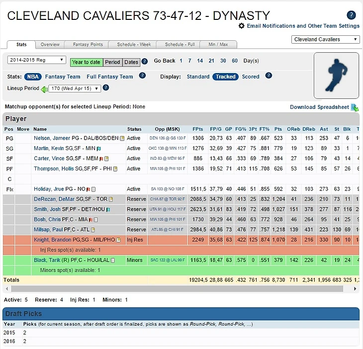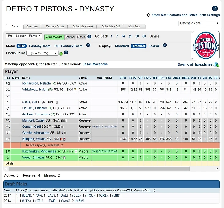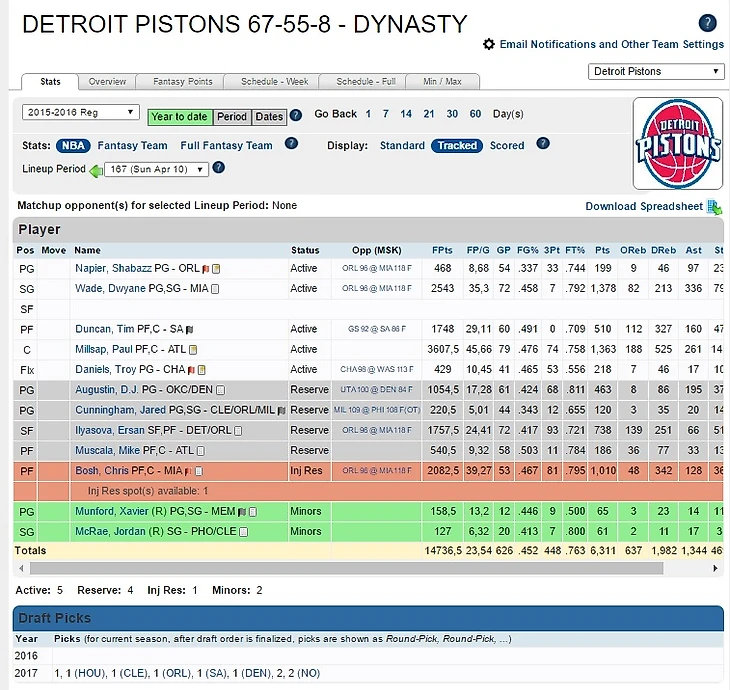 Изначально команда называлась Cleveland Cavaliers и управлял ей старожил фэнтези – Вова-ТОРОНТО! В октябре 2015 года из-за скандальных трейдов Вова покинул свой пост, а его место заняла уже известная нам Olenka. В марте 2016 года Olenka вместе с названием «Cleveland Cavaliers” переехала к составу тогдашнего Детройта. Вова получил свою команду назад, но под новым названием – Detroit Pistons. Вот такая петрушка.