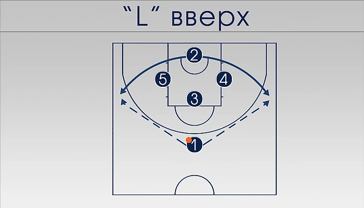 Комбинация предельно проста, но при должном умении и скорости очень эффективна. Разыгрывающий(1) находится в позиции «в лоб». На одной линии с ним располагаются ЛФ (3) и АЗ (2), так, что атакующий защитник находится в краске. Эти игроки создают центральную ось. Симметрично по отношению к оси, на границе трёхсекундной зоны располагаются большие игроки – ТФ (4) и Ц (5). По сигналу, АЗ выбегает из-за спины одного из больших на трехочковую дугу, получает мяч и совершает бросок.