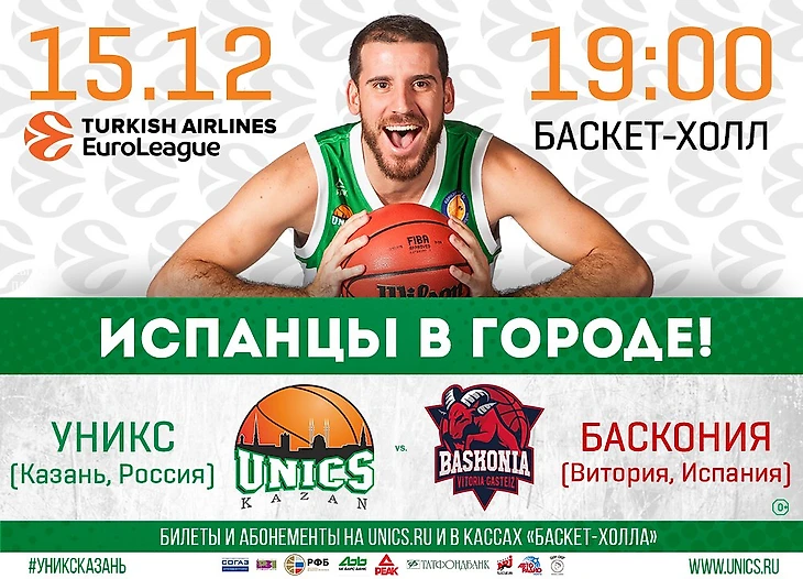 15 декабря в 19:00 УНИКС примет испанский клуб "Баскония" в Евролиге!