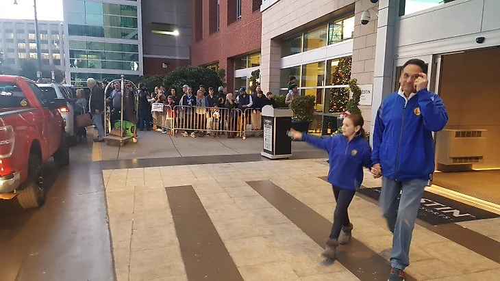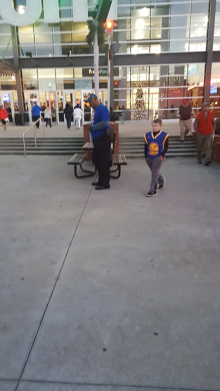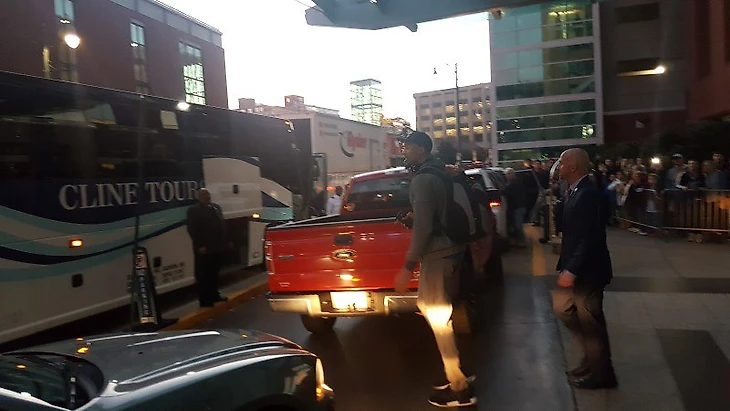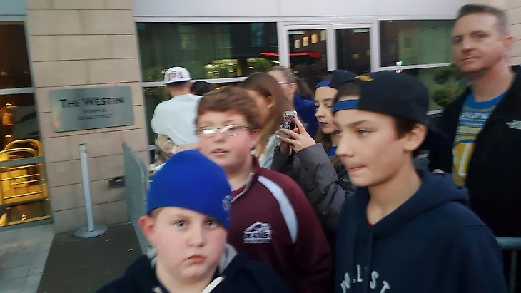 Обошел арену по кругу – понял что на арене команду никто не встречает – и вообще она вероятно высаживается из автобуса уже внутри арены. Но зато нашел отель Westin буквально через дорогу от арены где и остановилась команда и прямо в тот момент грузилась в автобус (несмотря на то что арена была в 300 метрах от отеля). Возле отеля стояла толпа мальчишек жаждущих автографов – все опять в майках Карри – ну и какое то количество взрослых. Я успел увидеть как в автобус проследовали Игудала и Ливингстон, на вопли детей об автографах никак не отреагировавшие. Стэф уже был внутри и иногда поглядывал в окно, но было видно, что он ничего не видит и просто настраивается на игру в своих наушниках. Последним вышел Лейкоб видимо со своей дочкой/внучкой – и после этого автобус уехал делать круги вокруг арены.