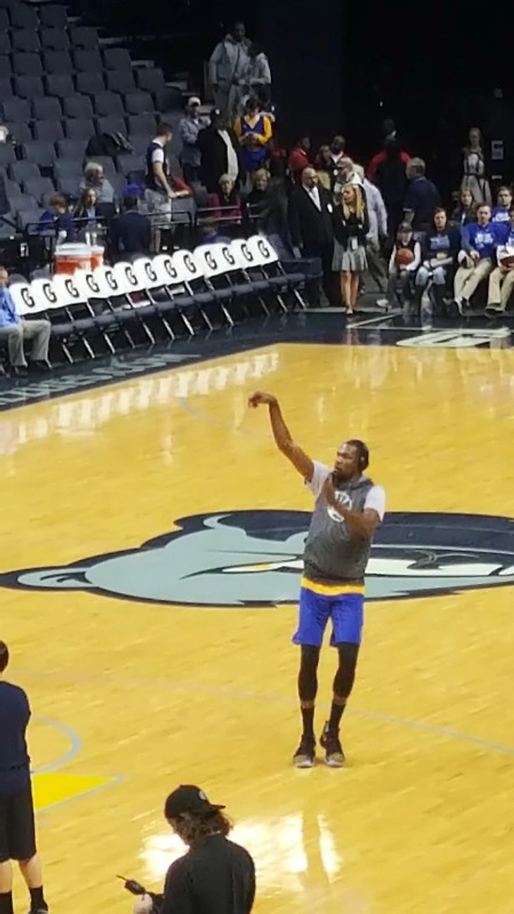 Тем временем на площадку подтянулись другие игроки – в частности Томпсон и Дюрант. Дюрант вызвал не меньший переполох среди молодежи. Было очень забавно как все они протягивали ему майки с номером 30 для подписи. Но он когда выходил не обратил на них никакого внимания – тем более он и на площадку решил выйти в наушниках. Прямо в них так и разминался. И он и Томпсон в основном на разминке кидали дальние броски, хотя Томпсон еще поотрабатывал проходы. Оба особенно не напрягались, хотя и не дурачились совсем как Стэф и бросали нормально, без приколов. Но до трудяги Зазы им было далеко. Грина я вообще не заметил на разминке – возможно он размялся раньше всех. Прямо возле выхода из раздевалок местные журналисты пытали Керра – он что то им рассказывал, но было не слышно что именно.