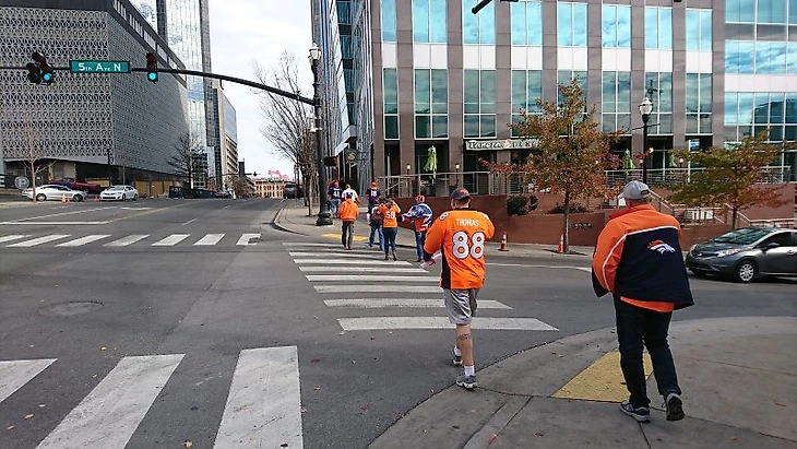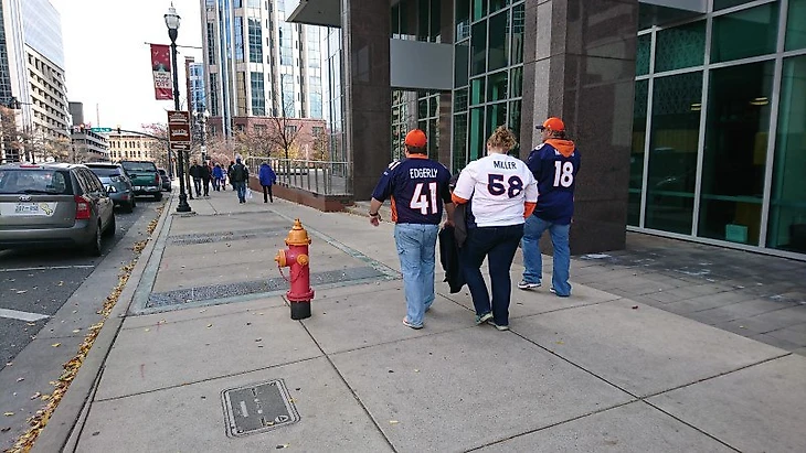 Но в целом болельщики Денвера, и те что сидели справа – и тысячи других вокруг - и после досадной игры продолжали шутить, когда всей толпой шли в даунтаун, такой вот позитивный народ. Кстати уже через 10 минут после конца игры я был в даунтауне. Вход и выход с арены организован, конечно, идеально – 70 тысяч рассосалось моментально – никаких ограничений на выход и заторов нигде не было – часть толпы пошла на специальные шаттлы, которые выстроились в длинную очередь и разъезжались очень быстро, часть пошла на парковку, часть пешком в даунтаун. Я конечно как русский человек немного схитрил и пошел не по огороженному тротуару как все приличные американцы – а по проезжей части – нам же закон и правила не писаны, мы их всегда понимаем творчески – благодаря этому дошел до центра города за 10 минут, но и остальные думаю дошли примерно за 20.