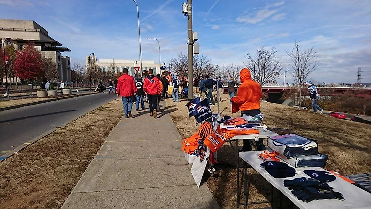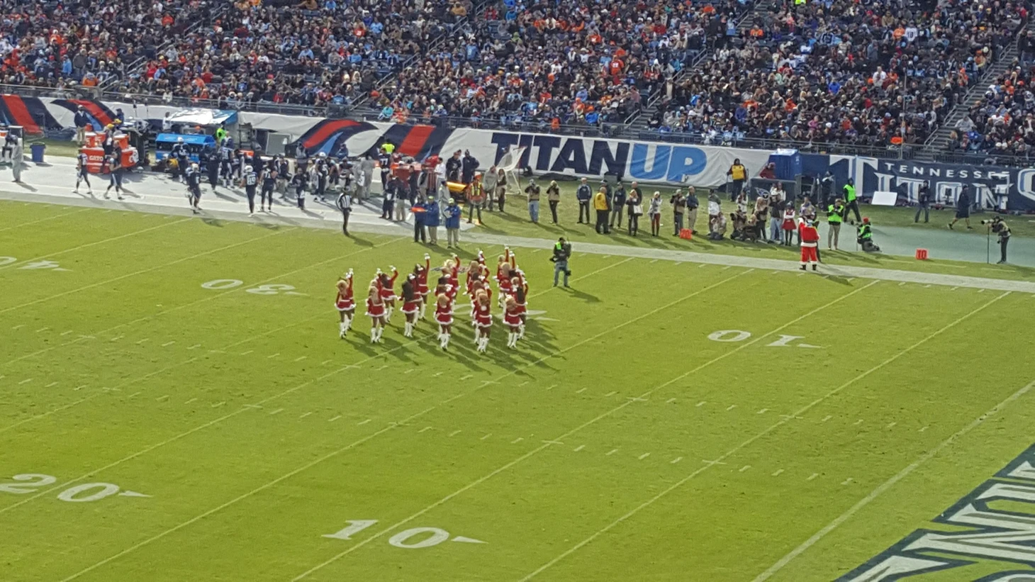 Погода была изумительная. По ощущениям нрадусов 15-17 тепла, ясное небо и солнце, которое правда било в глаза и немного слепило всю первую половину. Декабрь в Теннесси конечно просто супер. Мне в кофте было жарковато, хотя многие на трибуне сидели в шапочках, хорошо хоть не таких как в НЙ. Правда потом набежали облака и немного похолодало.