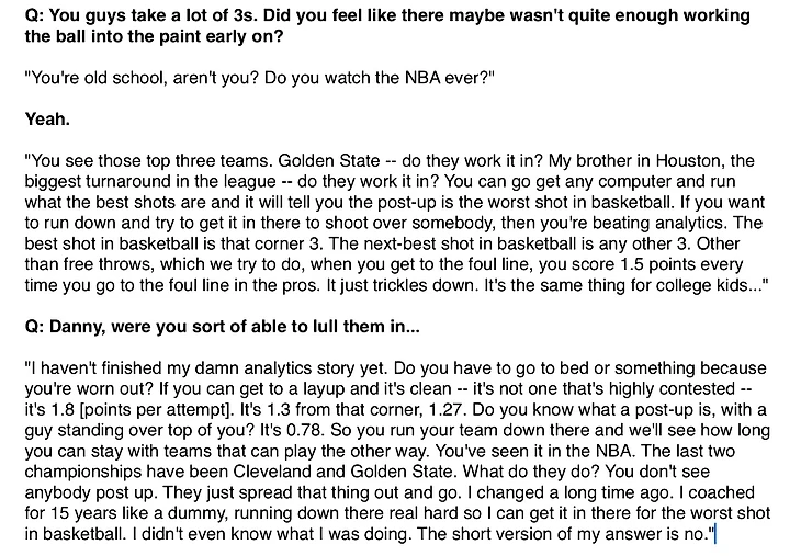 «Я еще далеко не закончил со своей чертовой аналитикой. Бросая открытый лэй-ап вы зарабатываете в среднем 1,8 очков за попытку. Трехочковый из угла – примерно 1,3 или 1,27 очков. С помощью броска спиной к кольцу – 0,78 очков. В общем, попробуйте играть традиционным способом, и я посмотрю, как долго вы будете оставаться в игре против команд, которые играют современно».