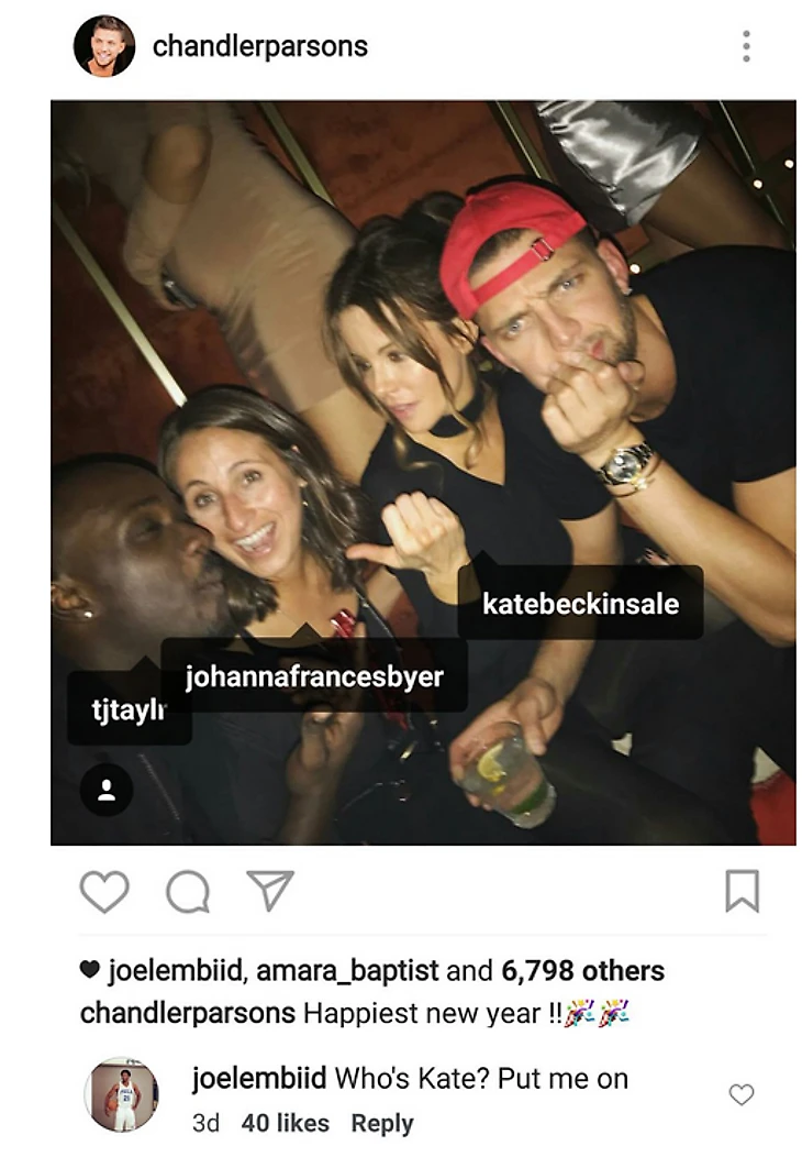 Итак, начиналось все стандартно. Эмбиид заглянул в инстаграм Чендлера Парсонса и выразил желание познакомиться с «вот этой Кейт».