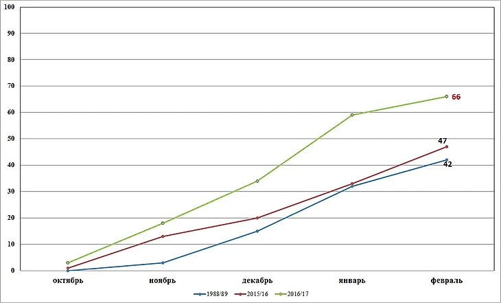 Несмотря на публичное равнодушие к ТД со стороны некоторых предрасположенных к ним игроков (в первую очередь, Дрэймона Грина), на момент публикации статьи были собраны 66 (!) выкладок, что уже является абсолютным рекордом для середины зимы. Согласно приведенному ниже графику, при сохранении нынешних темпов знаковая планка в 78 ТД может быть преодолена уже в марте!