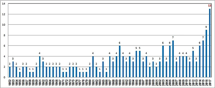 На графике ниже представлено количество игроков с PER 25 и выше, проведших не менее 5 игр, в каждый из семидесяти сезонов НБА.
