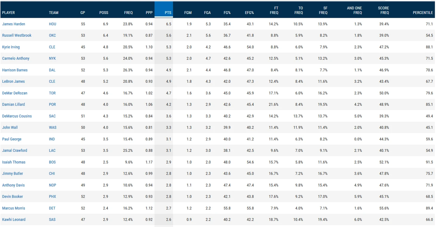 Данная фантазия построена на примитивной (хотя и несовершенной) методологии. Изучается арсенал тех игроков, которые занимают видные позиции по количеству «изоляций» и заработанных в ходе подобных розыгрышей очков. В данном случае не учитываются задействования игроков в «посте» («пост-апы» относятся к другой статистической категории), но в смысловом отношении от этого пост (в значении «материал») только выигрывает. Любители олдскула сейчас расскажут, до чего прекрасны все эти закорючки из усов и пихания толстяков под щитом, хотя, на самом деле, все они мало чем отличаются друг от друга и слишком постны, то есть лишают мир разнообразия. История же эта скорее про разнообразие и присущие ему характеристики, а не про неотразимость-эффективность.