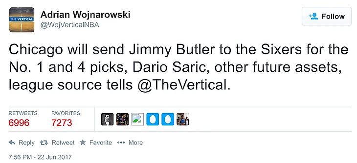 Кевин О`Коннор: Это утро перед драфтом НБА 2017 года. Джимми Батлер просыпается от телефонного звонка ГМа «Буллз» Гара Формана. «Эй, Джимбо, мне очень жаль, но к концу вечера мы обменяем тебя на самое лучшее предложение», говорит Форман. «Мы уже получаем предложения от…» Батлер прерывает его и орет, «НЕ.НАЗЫВАЙ.МЕНЯ ДЖИМБО!». И вешает трубку. Агент Батлера сливает информацию, что его клиент подпишется только с реальным претендентом на титул, когда он станет свободным агентом в 2019 году, но это не имеет значения: офферы приходят от всех команд.