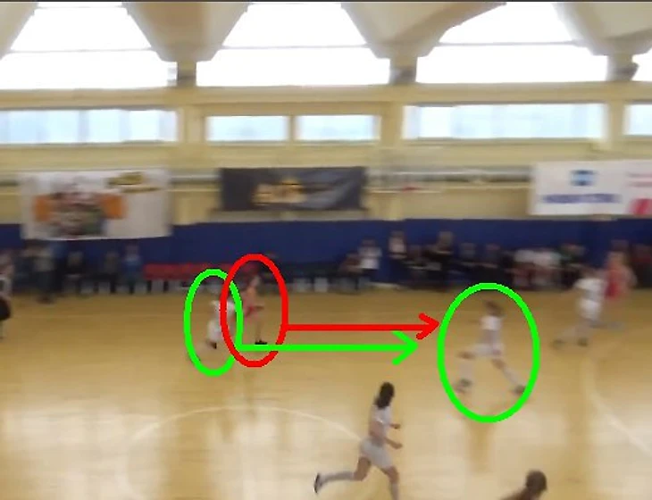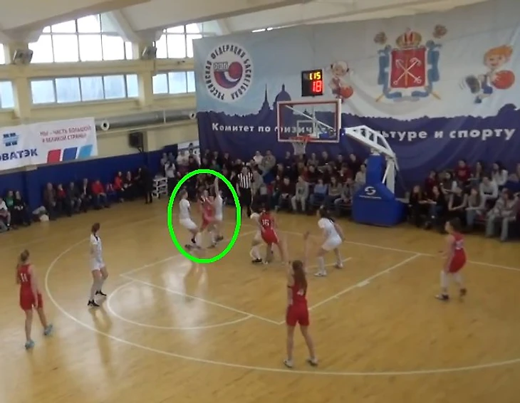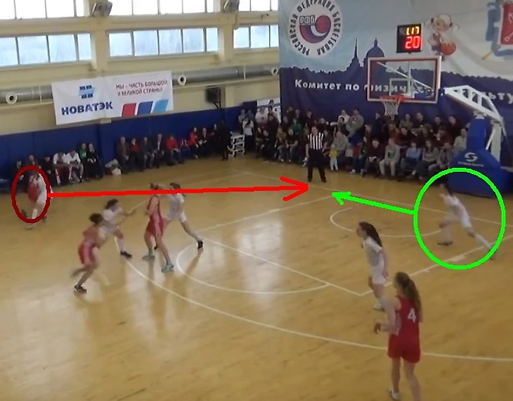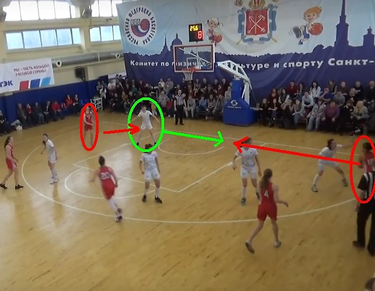 РАНХиГС вводит мяч из-за боковой, Актавина делает передачу Важовой. Важова обыгрывает Иванову (рис. 1), но «врезается» под кольцом в Крамаровскую (рис. 2), сместившуюся туда для «подстраховки» подруги по команде. Актавина «вылавливает» мяч, но тут же Елизавете Балыковой удается совершить перехват.