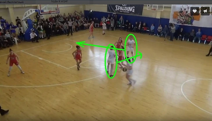 Балыкова начинает новую атаку политеха. Елизавете удается пик-н-поп с Натальей Букур: Наталья «открывается» на дуге, на которую не сразу переключается Ксения Емеличева, Иванова устремляется под кольцо, чем отвлекает внимание Важовой (рис. 3). Этого секундного замешательства игроков РАНХиГС хватает Букур для того, чтобы реализовать «трешку» (64:68 за 44 секунды до конца).