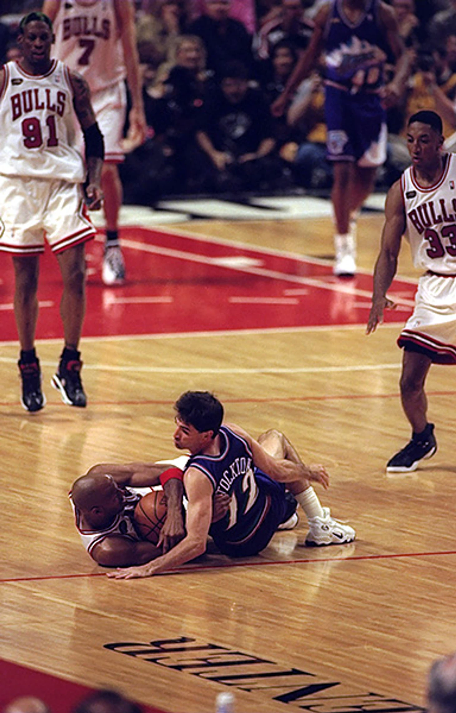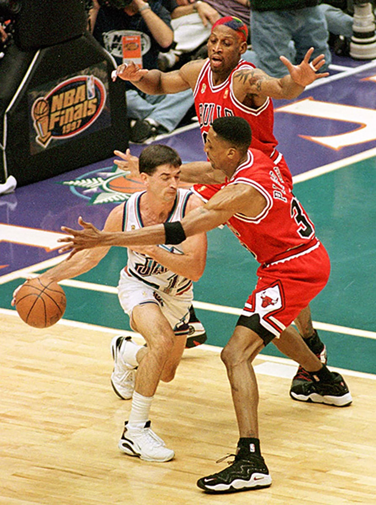 Карл подтвердил мудрость Джерри в конце одной тренировки. Образовался спонтанный турнир один на один. Молодые начали подначивать Почтальона: «Давай, старик. Выйди и покажи себя. Старик, тебе уже не угнаться за нами»… Карл услышал достаточно. Он встал со стула с таким кряхтением, как будто дедуля поднялся из кресла-качалки. Медленно похромал под щит, чтобы расправиться с молодыми бычками. Я видел, как загорелись его глаза, когда началась игра. Молодые, как и несколько говорливых ветеранов, были обречены. Он безжалостно разбил каждого. Мужчина против детей, это выглядело неравным сражением. Разговоры затихли на мгновение, когда он вернулся на свое место, улыбнулся и подмигнул им. Но упорное напряжение между молодыми и ветеранами никуда не делось.
