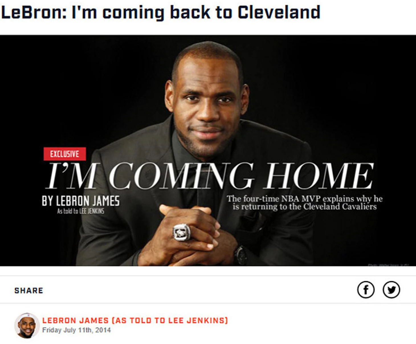 «После провала «Решения» команда Джеймса много времени уделила вопросу о том, как именно рассказать о переходе. Помощник Леброна по связям с общественностью Адам Мендельсон договорился с журналистом Sports Illustrated Ли Дженкинсом, что это произойдет в форме открытого письма от первого лица.