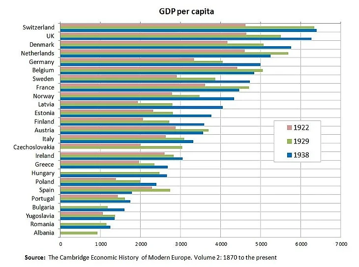 конечно это всего ВВП на душу и тут масса погрешнойстей и нюансов, тем более система национальных счетов в эпоху развития идей Саймона Кузнеца это все определенная условвность, и даже блестящие экономисты Кембриджского университета (к слову в свое время абсолютно сильнейшие в мире - там школу экономики строили такие люди как Кейнс, Маршалл и Пигу - мировые суперзвезды своего времени и экономикческой науки вообще) вряд ли могли учесть все нюансы экономик того периода. Конечно экономики и прибалтики и финляндии были тогда достаточно сильно аграрными, но ровно также было и в половине Европы - Греция и Португалия мало чем от них отличалась, а вот по трудолюбию прибалты думаю были выше южной европы уже тогда. и к слову те 20 лет независимости они провели не напрасно - с 1922 по 1938 году их экономики можно было считать быстро растущими.