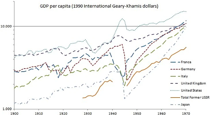 2. Но были 2 страны которые после войны развивались даже куда быстрее чем США и их постоянно догоняли. по совпадению это две самые пострадавшие во время войны страны и два главных проигравших. из графиков видно что как это ни странно но ВВП на душу населения в разоренной Германии упало практически до уровня тоже сильно пострадавшего, но построевшего как и Америка мощную военную экономику во время войны СССР, то есть как ни смешно Германия и СССР находились почти на одном уровне (что конечно не значит что уровень жизни был сравним даже тогда - все же ВВП СССР в основном состояло из неполезной для населения военной промышленности и подобных производств - а в Германии после войны именно эти отрасли были полностью уничтожены - поэтому если смотреть именно по доходам граждан и гражданского ВВП там скорее всего был все равно разрыв раза в два-три, но чисто по цифрам общее ВВП на душу было почти идентичным). Япония же упала еще значительно ниже, была разрушена еще сильнее чем Германия, вложила в войну еще больше ресурсов страны и находилась на уровне ниже СССР по доходам населения.