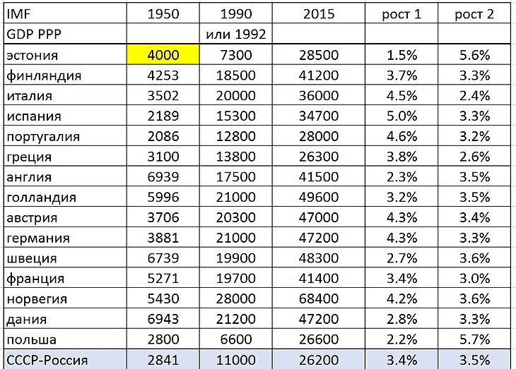 Конечно тут много условностей. измерения 1950 и 1990 находятся в одной валюте - долларах 1990 года - но немного имеют разные подходы, ВВП 2015 соответственно номинальное в долларах 2015. Ну и понятно никто никогда не узнает реального ВВП Эстонии в 1950 - это уже сложно понять и достать - поэтому здесь примерная оценка исходя из логики развития соседей в тот период. скорее всего немного заниженная оценка, послевоенный рост в СССР был очень бурный - в т.ч. за счет того же ГДР и Эстонию после войны конечно сильно застраивали чтобы окопаться на территории и укрепить позиции. Плюс по Эстонии как и по России нет данных 1990 года - я взял данные 1992 - возможно они были чуть ниже чем 1990 учитывая что тогда творилось в стране - но этим можно пренебречь, глобально на итоги это не влияет. Суть не изменилась - если в 1938 г. Эстония жила лучше Финляндии с Польшей и намного лучше условной Испании и Греции - а потом сильно им всем проиграла, что в 1990, что в 1992. в разы. и такой рост за такой период - это кошмар, он был намного ниже чем в целом по Европе. Ниже даже чем в СССР который рос вполне неплохо - и Россия в 1992 году была уже богаче Эстонии - хотя в 1950 была в среднем беднее (понтяно там и нефть и прочее - но факт).