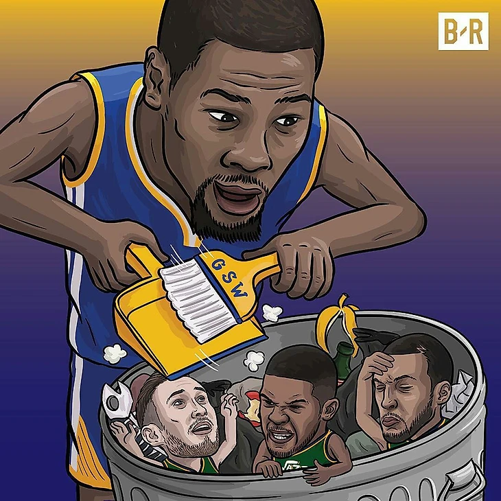 Зачем?! Зачем это делают? Почему бы не довериться условному Кармело Энтони (LOL) и попробовать максимум выжать из имеющегося состава? Известный философ Рики Боби писал: "Если ты не первый, то уже последний." ТВОЕЙ целью (если ты руководитель франшизы НБА) должен стать титул Ларри О'Брайена, а не победа в дивизионе (хотел написать про Атлантику, Торонто Рэпторз и Кайла Лаури, но затем вспомнил про того самого чувака с драфта-2011, так что аналогий нет. Maybe, Utah Jazz? Нет, серьезно, верите ли вы, что джаззмены смогут уцепиться хотя бы за финал НБА, даже если Хэйвурд и Ко все разом выйду на прайм своей карьеры? Да Дюрант с Карри их вынесут с Оракл-Арены не в 4-ех, так в 5 матчах серии, примерно как на этой фотографии: