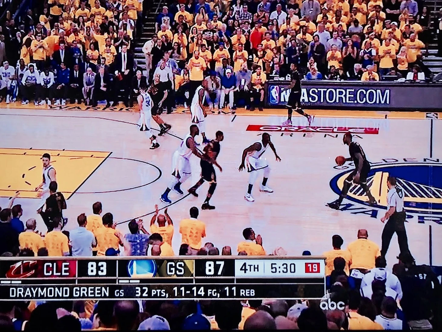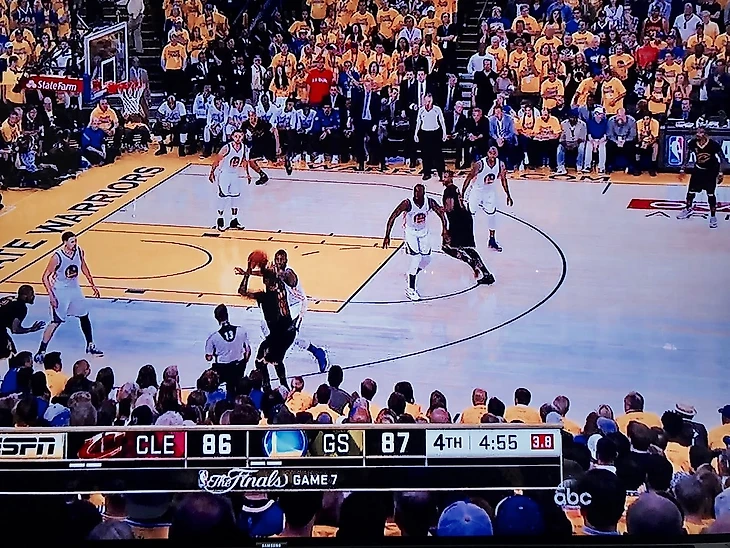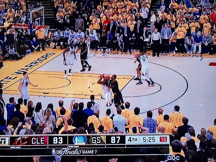 «Голден Стейт» 87, «Кливленд» 86. После того, как пас Карри за спиной усвистал за пределы площадки (йоу), Леброн запросил заслон у Томпсона, но Дреймонд преодолел его и остался возле Леброна. Терминатор Леброн попробовал еще раз, оказавшись напротив Изели, с истекающим временем на атаку. Только на этот раз он знал, что Изели слишком напуган, чтобы клюнуть на фальшивый бросок ...