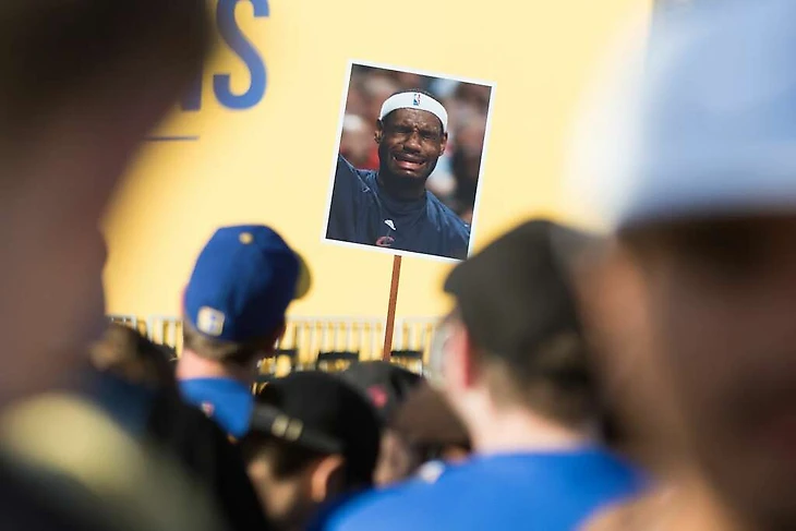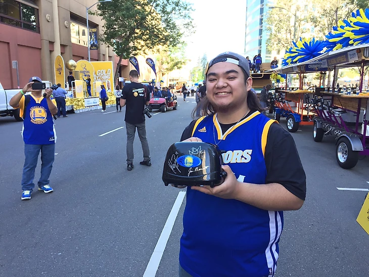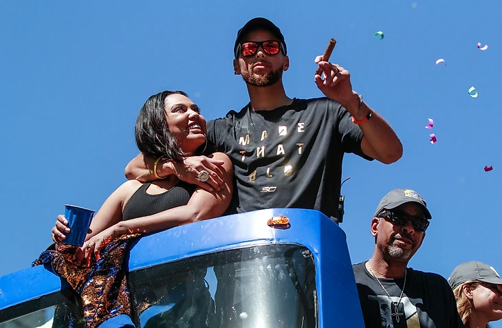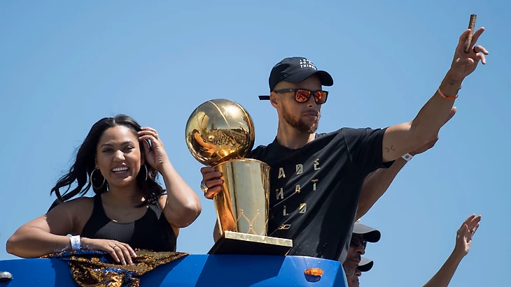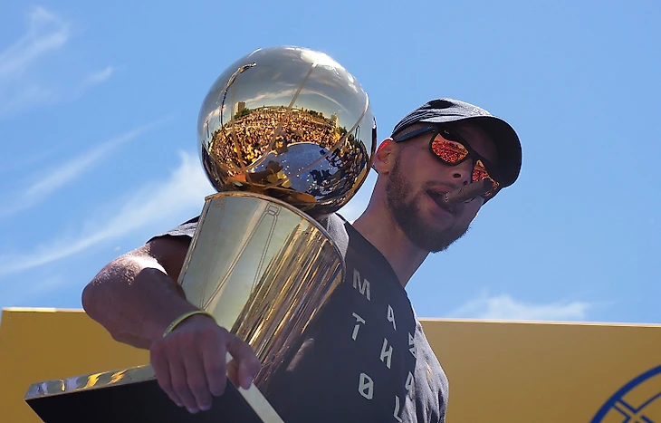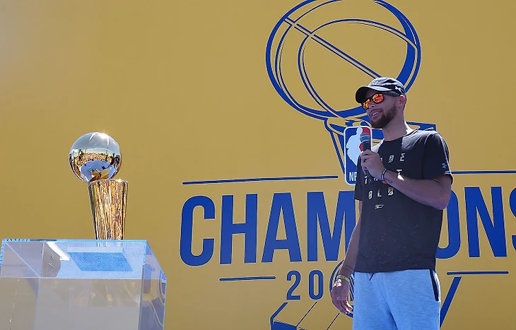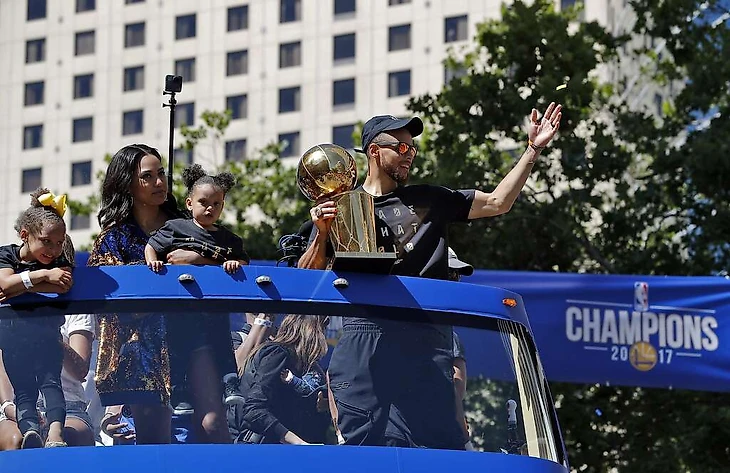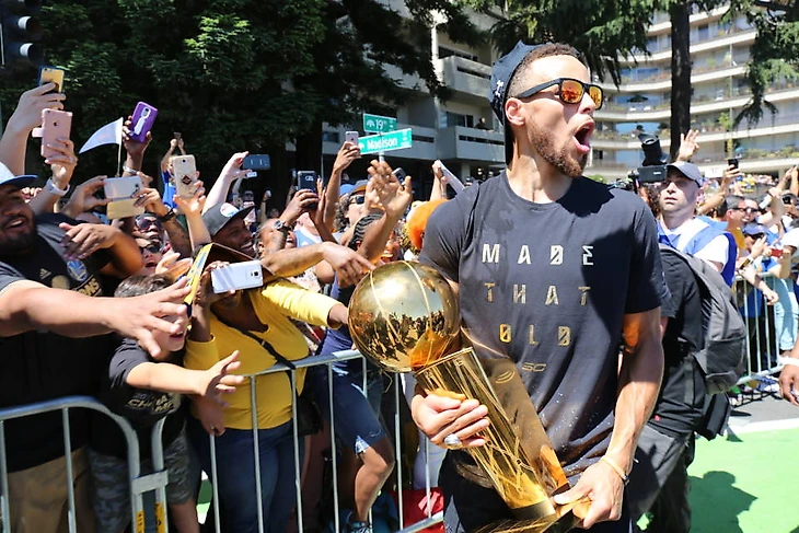 Наконец под бурные овации и скандирование "MVP! MVP!", появился и Стеф Карри с кубком Ларри О'Брайена.