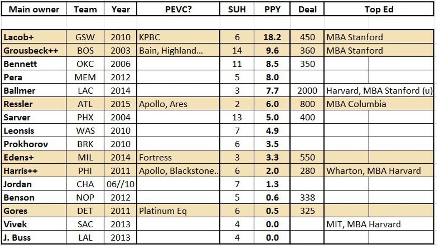 Цветом выделены финансисты из PEVC. На первый взгляд после Бостона и ГС других успешных примеров положительных перемен от таких собственников нет. Атланта была продана всего 2 года назад и там и так была более менее приличная команда и пока рано делать выводы. А Милуоки, Филли и Детройт пока не радовали новых владельцев. Но это очень очень условно. Все понимают что знаменитый Процесс который и был запущен с подачи нового владельца-финансиста (Хинки был просто идеолог и исполнитель) вроде дает результаты и никто не удивится увидев Филли в финале через несколько лет (по крайней мере она была одним из лидеров в моем конкурсе прогнозов на 2020 год) - во многом их крайне радикальная стратегия оказалась весьма успешной, при всей споей спорности.