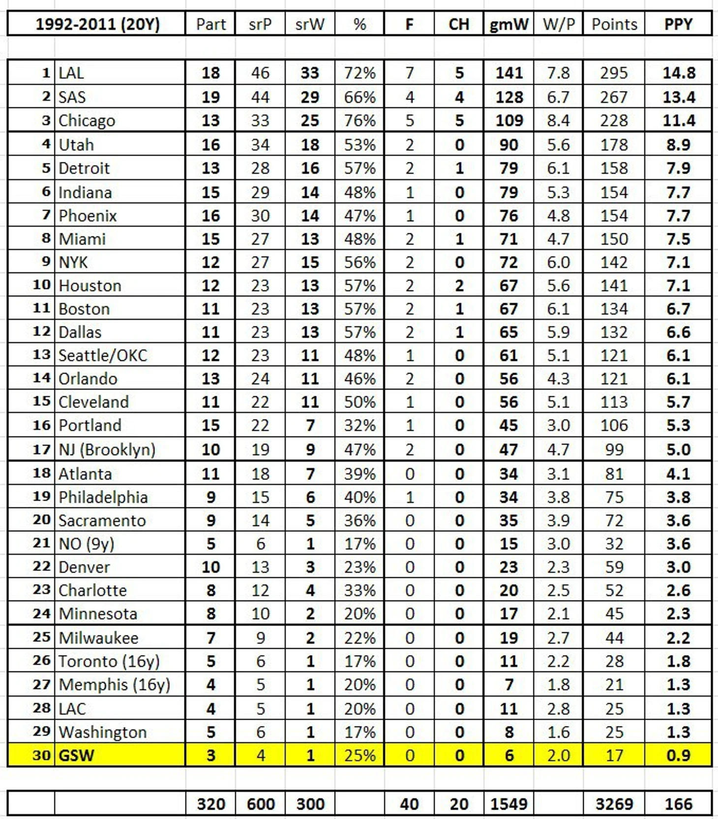 Как хорошо видно из таблицы, успехи команд за весьма длинный 20-летний период крайне крайне неравномерны. 3 команды доминировали в этот период, выиграли 14 титулов из 20, почти каждый год играли в плей офф, имеют порядка 70% побед в сериях плей офф, более 100 выигранных там матчей и более 220 очков, которые я ввел для сведения в единый показатель общей успешности франшиз в определенный период времени (1 победа в ПО – 1 очко, выход в ПО – 3 очка, победа в серии – плюс 2 очка, выход в финал – еще 2, чемпионство – еще 4 бонусных очка). Эти 3 команды имели на протяжении 20 лет в среднем 11-15 очков за сезон - в 2-3 раза выше среднего по лиге.