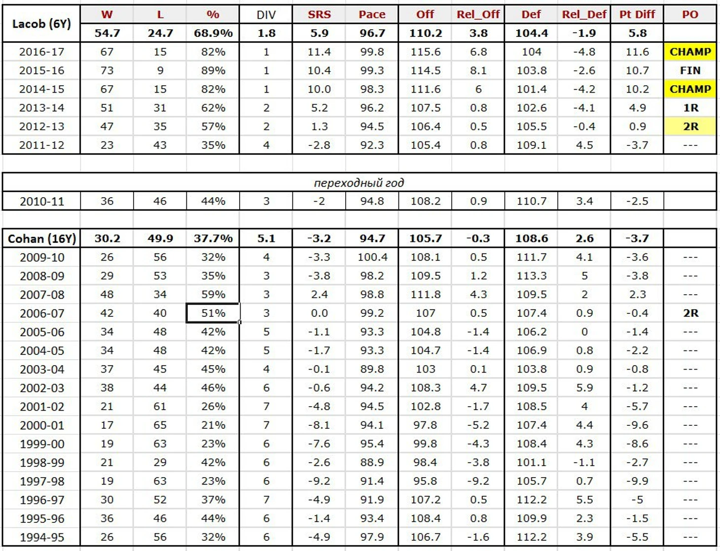 Сравним 6 лет Лейкоба (уже достаточный период для выводов) и 16 лет прежнего владельца - Кохана (тем более достаточный). У одного было 38% побед в регулярке - у другого почти 70% (исторический результат думаю). У одного ни одного 1 или 2 места в дивизионе за 16 лет - у другого 5 лет подряд из 6. У одного 105-109 средний счет в играх и минус 4! почти средний дифференциал (на протяжении 16 лет!!!) - у другого 110-104 и +6 - тоже феноменальный результат, который вряд ли кто когда-либо показывал на протяжении своего 6-летнего владения командой. То есть по сути при смене владельца команда сразу стала получать фору +10 очков по сравненнию с прошлым за матч - и это одна и та же франшиза и на довольно долгом этапе. Не думаю что есть игроки которые разом добавляют +10 за игру к результату команды на протяжении многих лет, даже Леброн - а тут просто новый владелец.