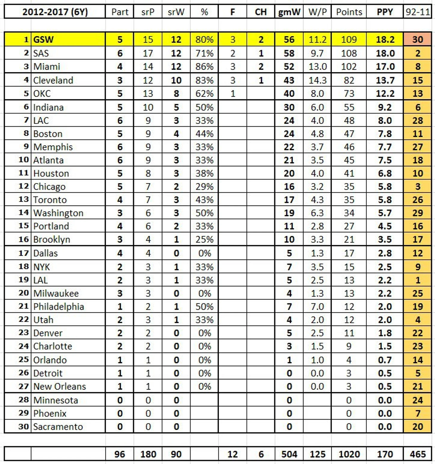 P. S. К слову об автокорреляции результатов в Лиге. Если просто разбить последние 26 сезонов на 2 части - 1992-2011 и 2012-2017 и сравнить между собой то выяснится что если не учитывать феномен ГС то существует тесная положительная корреляция между очками за сезон у команд в первые 20 лет и в последующие 6 и она составляет 0.26, что достаточно много для таких длинных периодов времени. САС как были вторыми, так и остались, Индиана вечно 6я, Хьюстон, Бостон, Портленд, Нетс, Филли, Денвер, Шарлотт тоже остались там где и были много лет. Кто-то конечно поднялся, Клипперс и Мемфис например, Чикаго и ЛАЛ рухнули (вероятно временно - команды со 2го и 3го рынка в Штатах рано или поздно восстановяться в топ 10), но общая картина показывает что в лиге связь прошлого и будущего очень сильна и никакие драфты и звезды не могут этого изменить, поэтому фантастический взлет ГС выглядит особенно необычным и иррациональным.