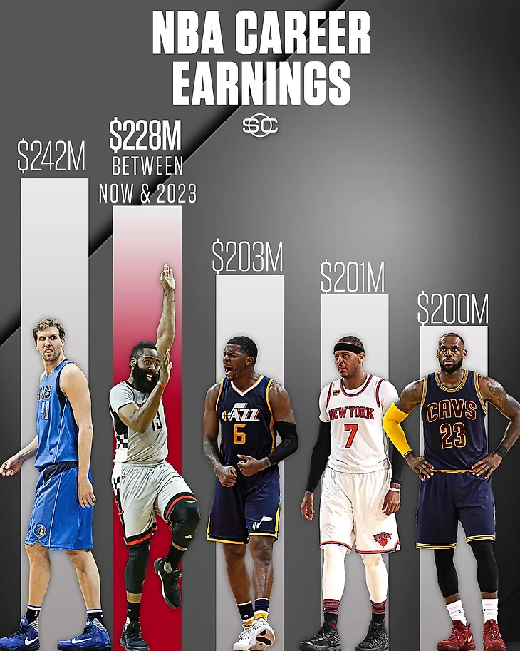 Рекорд Стэфа Карри продержался недолго. Отныне Джеймс Харден – обладатель самого крупного контракта в истории НБА, а небольшая инфографика выше позволяет оценить значимость данного события. Приплюсуйте сюда недавнее соглашение с Adidas на 200 млн. – и вот Вам очередной аргумент для детишек из Комптона в пользу того, что в руки лучше брать мяч, чем микрофон или пистолет.