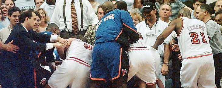 Скамейка «Хит» осталась сидеть – возможно, помогло то, что судья Дик Баветта был рядом – но Хьюстон и Джонсон, которые лишь секундами ранее отправились на скамейку «Никс», выбежали на паркет, чтобы разнять игроков. Старкс тоже вклинился в драку с боковой линии, заработал технический и удаление, показав при этом средний палец фанатам «Майами» по пути в раздевалку. («Потому что мне так захотелось», объяснил он тогда; позже был оштрафован лигой на 5 тысяч.) Юинг, который чуть раньше отправился отдыхать, замешкался возле скамейки «Никс».