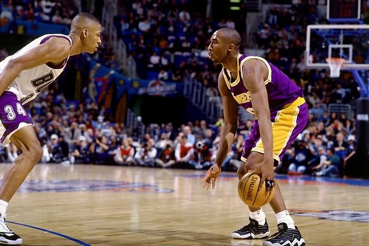 По итогам дебютного сезона Аллен был включён во вторую сборную новичков, набирая в среднем 13.4 очка в среднем за игру. На фото Рэй защищается против молодого Кобе Брайанта, который был выбран на том же драфте под 13 номером.