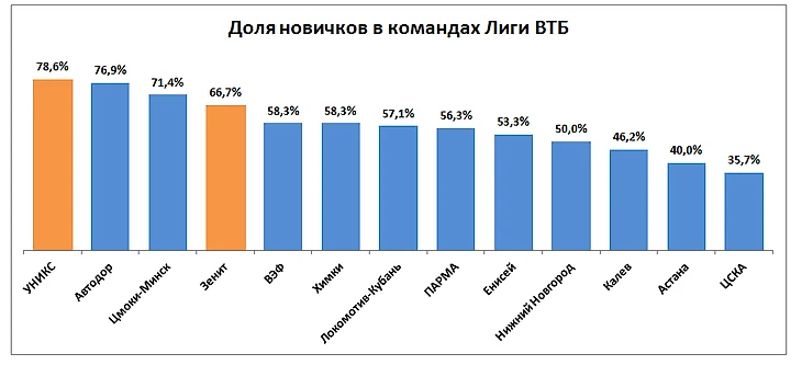Новички. В нынешнее межсезонье обе команды прошли через серьезного обновления. Казанцы, например, удерживают первое место как по абсолютному количеству новичков (11), так и по их доле в заявке команды (78,6%). «Зенит» также входит в четверку лидеров этого своеобразного рейтинга.