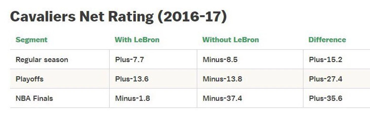 В результате, как только Джеймс садился на скамейку, команда моментально разваливалась, что отчётливо подтверждает статистика: