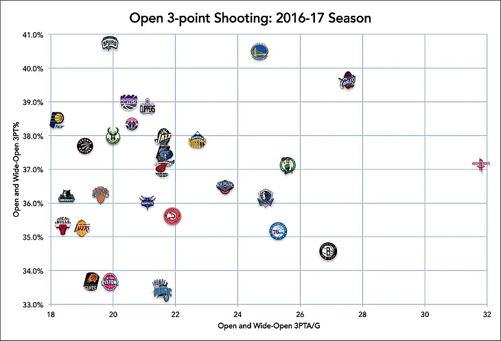 2. Это команда, которая создает едва ли не больше всех открытых дальних бросков и уступает лишь «Хьюстону» и «Кливленду». Но при этом не может их реализовать с достаточной эффективностью.