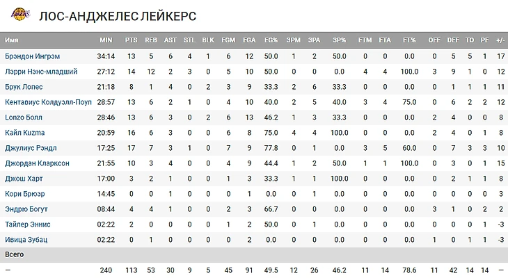 Кайл Кузма 16/6/3 + 0 потерь при 75% с игры включая 4/4 с дуги за 20 минут (двадцать, карл). Нельзя не отметить удачную игру в защите.