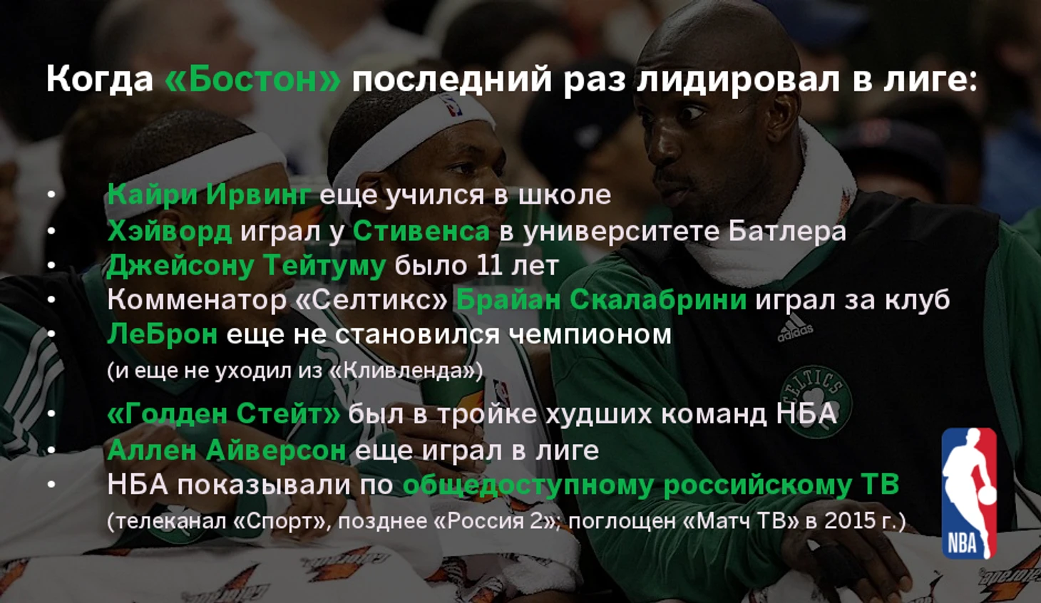 После победы над «Оклахомой-Сити» «Селтикс» взобрались на первую строчку в таблице регулярного чемпионата НБА – у «Хьюстона» тоже 7 побед, но на одно поражение больше, а у «Клипперс» при двух поражениях пока только пять побед. «Бостон» в прошлом году занял первое место в «регулярке» на Востоке, но в общей таблице на первой строчке «кельты» не появлялись уже очень давно.