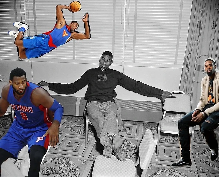 Драммонд на самом левом стуле, Ховард парит в воздухе, в центре легендарный Уилт Чемберлен, а ДеАндре скромно сидит в сторонке.
